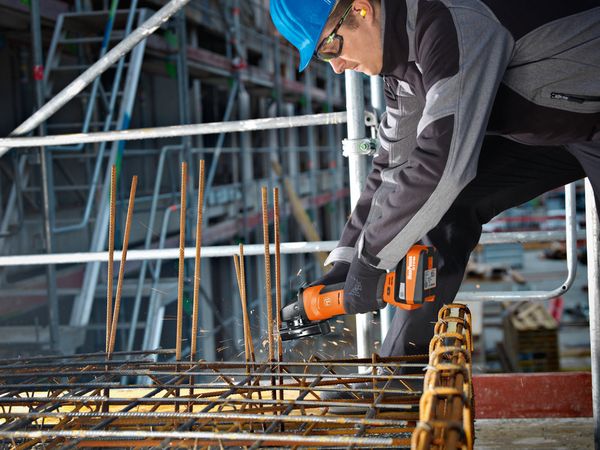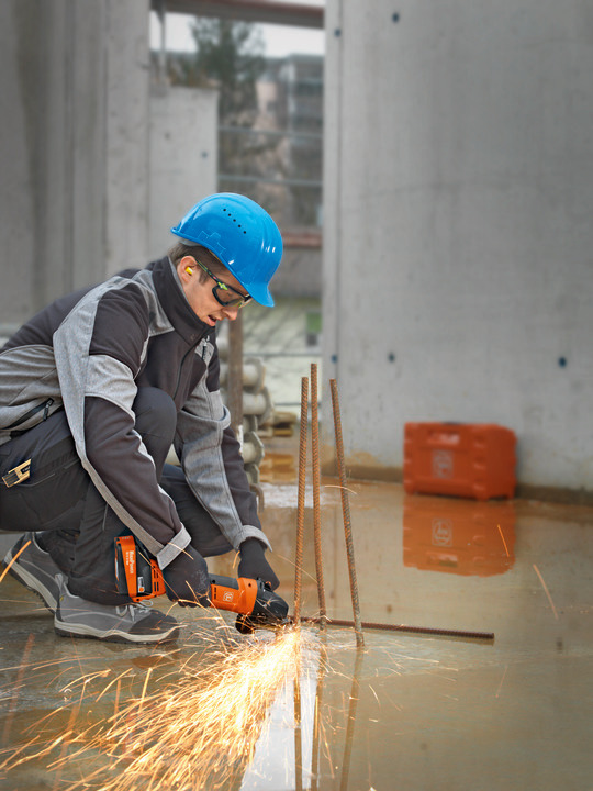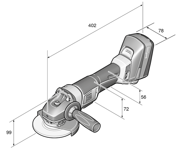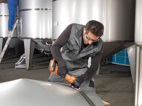 Мощная и пылестойкая аккумуляторная угловая шлифовальная машина с предупредительным сигнальным устройством для эффективного выполнения работ по отрезанию, шлифованию и снятию заусенцев в ходе монтажа.